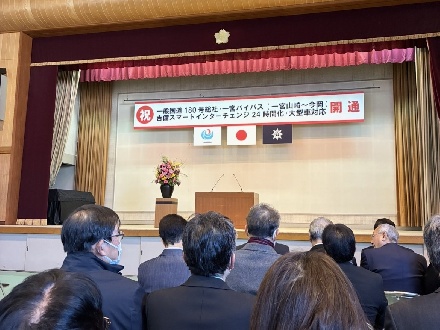 開通式は平津小学校にて式典が行われ、その後、サービスエリア付近において祝賀行事が実施されました。地元の皆さまをはじめ、多くの関係者が長年待ち望んできた事業であることを強く実感する、印象深い式典でした。