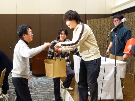 忘年会では、121名が参加し、景品をかけたくじ引きを行いました。